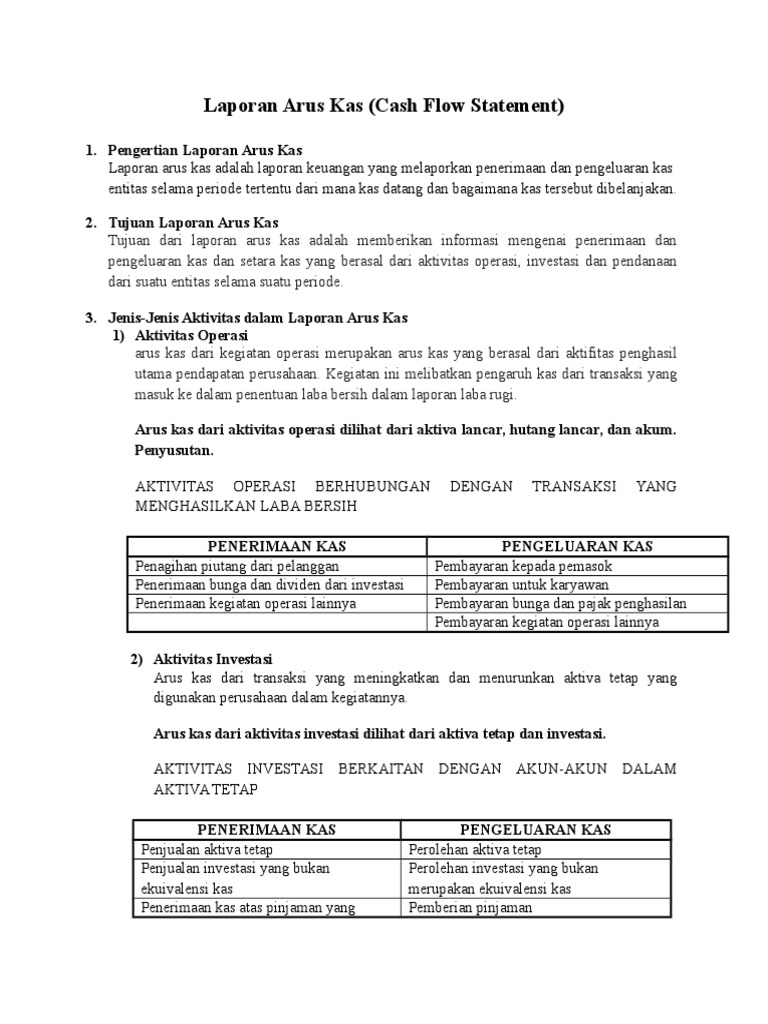 Arus kas dari kegiatan investasi. Karena ada peningkatan investasi pada peralatan dan kendaraan maka mengurangi Kas yang mana masing-masing peningkatan 4.000.000 maka total pendanaan investasi 8.000.000. Arus kas dari kegiatan pendanaan. Penurunan utang bank (5.000.000) Kenaikan modal 4.600.000. Total (400.000) Karena itu aktivitas operasi mempengaruhi laporan laba rugi, yang dilaporkan dengan dasar akrual. Sedangkan laporan arus kas melaporkan dampaknya terhadap kas. Arus masuk kas terbesar dari opersi berasal dari pengumpulan kas dari langganan. Arus masuk kas yang kurang penting adalah penerimaan bunga atas pinjaman dan dividen atas investasi saham. Arus kas investasi merupakan bagian dari laporan arus kas atau laporan cash flow yang melaporkan perubahan posisi kas perusahaan yang dihasilkan dari kegiatan investasi pada pasar uang dan operasional anak perusahaan yang mengakibatkan perubahan pada jumlah yang dihabiskan pada investasi pada aset modal seperti peralatan dan barang modal.Oke mungkin agak susah dipahami, secara sederhananya ...