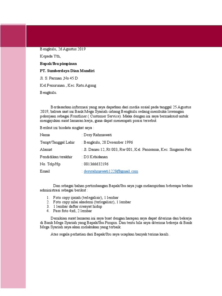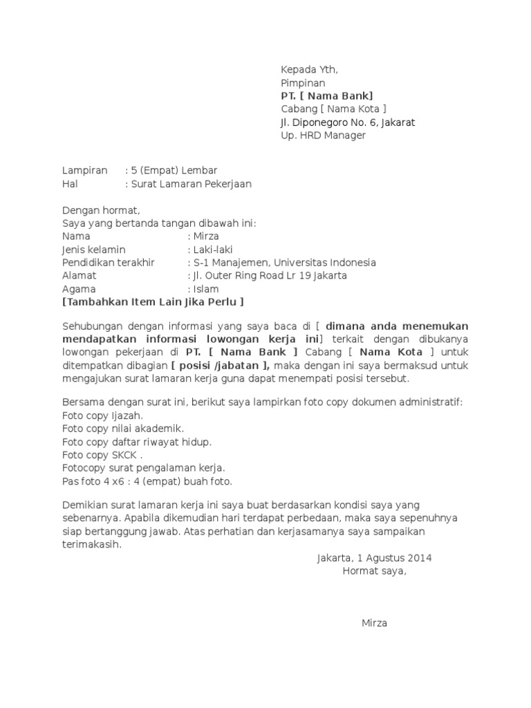 Surat lamaran kerja untuk bank