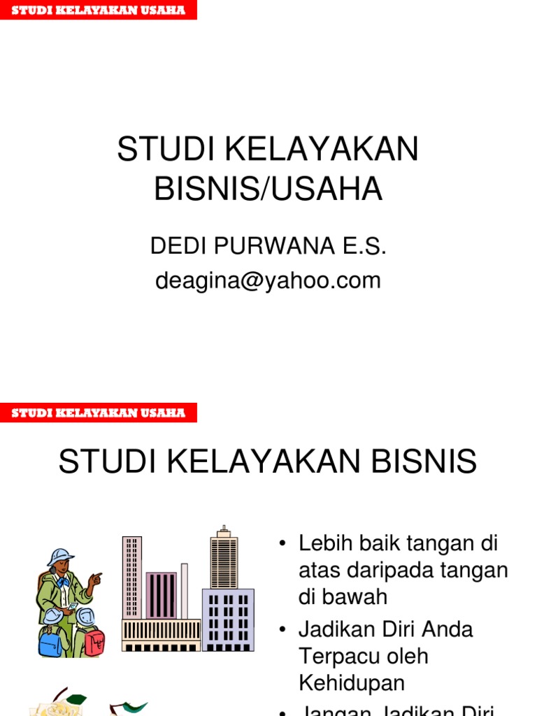 Mudah-mudahan buku ini dapat membantu para pembaca yang berminat untuk mengembangkan diri, memperkaya wawasan dan ... Studi Kelayakan Perusahaan atau Studi Kelayakan Proyek atau Studi Kelayakan Bisnis adalah penelitian tentang dapat tidaknya suatu proyek (biasanya merupakan proyek investasi) dilaksanakan dengan berhasil. ...