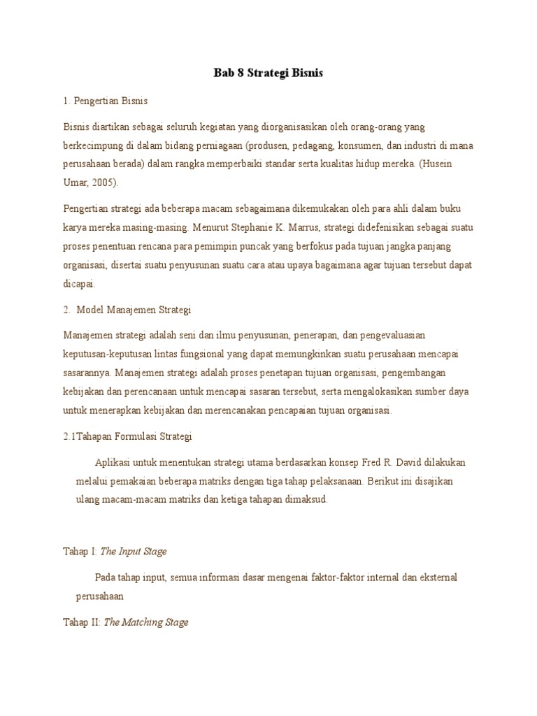 Strategi Bisnis merupakan suatu bentuk atau ide serta konsep maupun rencana yang dibuat untuk memajukan usahanya sehingga menjadi berkembang dan maju. Tanpa strategi bisnis akan mengalami kesulitan untuk bisa bertahan dalam persaingan pasar. Tujuan Strategi Bisnis Berikut adalah beberapa tujuan membuat strategi bisnis diantaranya yakni: A. Strategi Bisnis 1. Pengertian Strategi Strategi didefinisikan sebagai suatu proses penentuan rencana para pemimpin puncak yang berfokus pada tujuan jangka panjang organisasi, disertai suatu penyusunan, cara atau upaya bagaimana agar tujuan tersebut dapat dicapai (stephanie K. Marrus).1Strategi Dibawah ini diuraikan pengertian bisnis yang disampaikan para ahli: Menurut Hughes dan Kapoor (2010) Business is the organized effort of individuals to produce and all a profit, the good services that satisfy society needs. The general term business refers to all such effort within a industry. Bisnis terdapat jenis – jenis inovasi berdasarkan para ahli: Menurut Schumpter inovasi yang. dapat dilakukan wirausaha adalah: 1. Pengenalan suatu barang baru, atau perbaikan dari barang yang sudah ada. 2. Pengenalan metode produksi baru. 3. Pembukaan pasar baru, khususnya pasar ekspor pada daerah baru. 4.