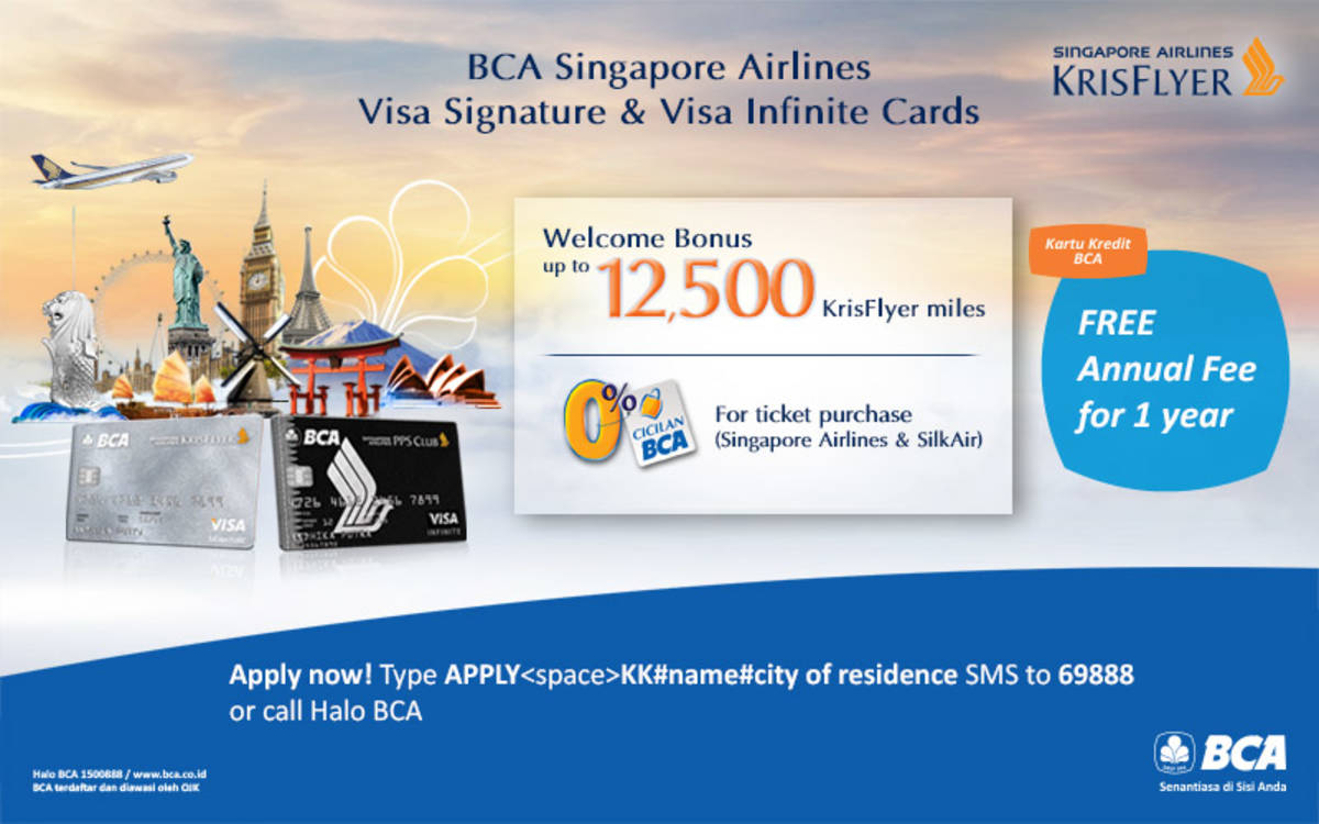 Benefits. Enjoy Early Bonus* Earn up to 10,000 KrisFlyer miles when you travel with BCA Singapore Airlines Krisflyer Visa Signature. You will earn a bonus of 3,000 KrisFlyer miles on your first billing and an additional bonus of 7,000 KrisFlyer miles will be credited to your account when your spending reaches Rp3 million within 2 months of issuance of the BCA Singapore Airlines Krisflyer Visa ...