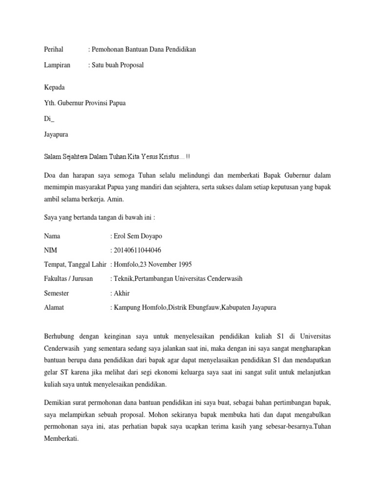 permohonan dana bantuan pendidikan oleh : heryanti. h nim : p. 201201401 stikes madala waluya tahun anggaran 2013/201... Telah melanjutkan studi pada Program Pascasarjana Megister Pendidikan Islam Universitas Muhammadiyah Surakarta, Program Studi Manajemen Pendidikan Islam, mulai tahun akademik 2010/2011. Oleh karena itu saya mengajukan permohonan Bantuan Biaya Studi (Beasiswa S2) kepada Dinas Dikpora KSB. Sebagai bahan pertimbangan saya lampirkan : 1. Biodata. 2. Saat memohon atau mengajukan beasiswa, surat tersebut diletakkan bersama dengan proposal beasiswa sebelum bagian pendahuluan. Surat tersebut berisi tentang perihal permohonan, maksud, tujuan, dan jumlah dana yang diajukan oleh si pemohon kepada yang ditujunya. Contoh surat yang satu ini bisa anda gunakan untuk permohonan beasiswa s1,s2,dan s3. RESUME PROPOSAL. PERMOHONAN BANTUAN BIAYA PENDIDIKAN. Proposal Permohonan Bantuan Biaya Pendidikan Pasca Sarjana Doktor (S3) Identitas Pemohon Nama Saidna Zulfiqar Bin Tahir NIDN 1211067402 Pangkat/Golongan Lektor/IIIc Pekerjaan Dosen Universitas Iqra Buru Telp 085243486068 Perguruan Tinggi Tujuan