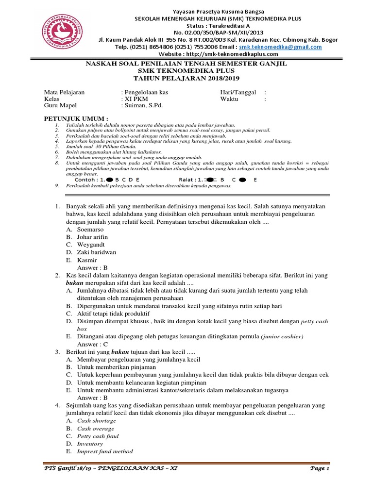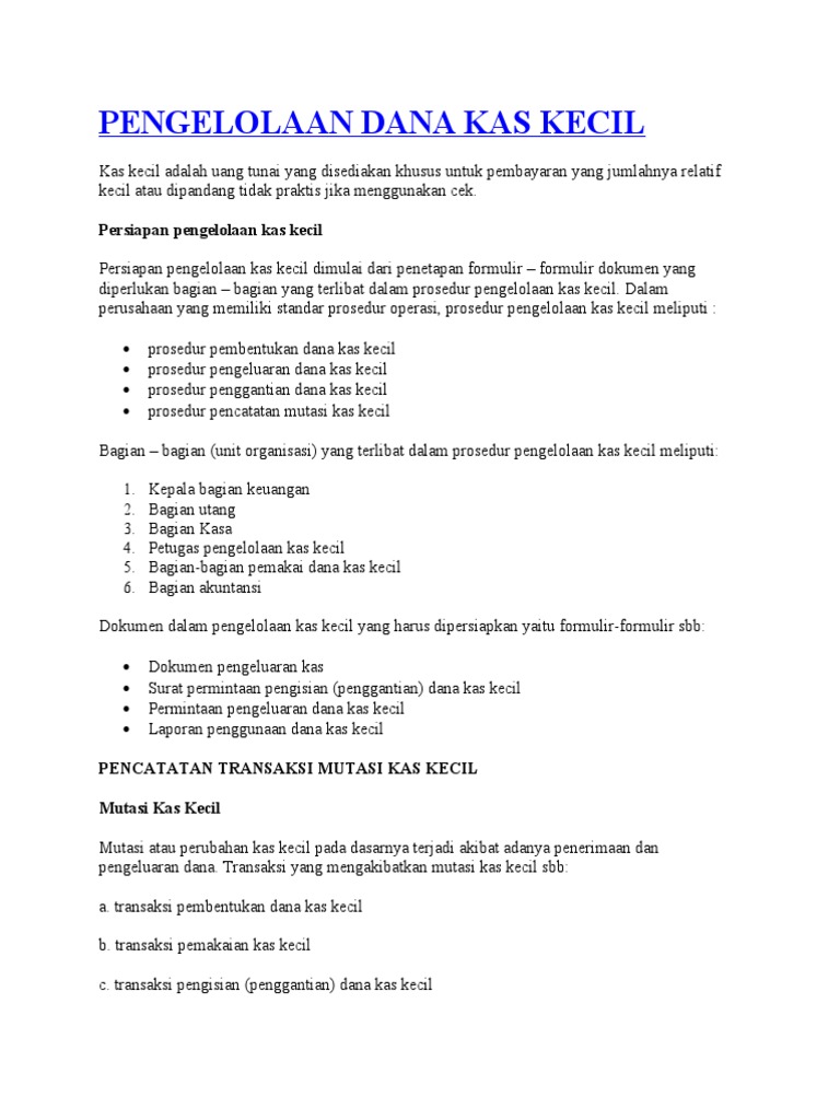 Sistem fluktuasi, yaitu perubahan jumlah uang kas kecil. Baik berupa polis maupun transaksi dengan pencatatan dilakukan selama ada transaksi dan rekening kas kecil selalu berubah. 3. Termasuk Kas. Setelah memahami pengertian kas, tentu yang menjadi pertanyaan adalah apa saja yang termasuk dalam kas itu sendiri. 33 Transaksi Apa Saja Yang Mengakibatkan Terjadinya Mutasi Dana Kas Kecil - Info Dana Tunai. Kas Kecil: Pengertian, Fungsi, dan Prosedur Pengelolaan - Zahir. Contoh Soal Kas Kecil Beserta Pembahasannya • Seven Accounting Bukti-bukti penggunaan dana kas kecil dikumpulkan oleh pengelola kas kecil. Pengisian dana kas kecil dilakukan dengan penarikan cek yang sama jumlahnya dengan dana kas kecil yang telah digunakan sehingga jumlah dana petty cash kembali kepada jumlah yang ditetapkan semula. Selanjutnya, berikut langkah-langkah yang dilakukan dalam metode tetap : 5.Sebutkan contoh kertas berharga yang dapat dianggap atau digolongkan sebagai kas? 6.Transaksi apa saja yang mengakibatkan terjadinya mutasi dana kas kecil? 7.Formulir apa saja yang disimpan diarsipkan oleh kasir kas kecil 8.Jelaskan secara singkat keguanaan bukti-bukti pengekuaran kas kecil dalam sistem dana tetap? 9.Sebutkan ciri-ciri ...