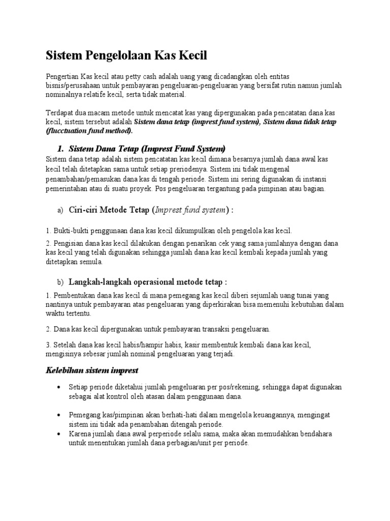 38 apa yang dimaksud dana kas kecil. Nov 3, 2017 — Pengelolaan kas kecil perusahaan dapat dilakukan dengan berbagai metode. Diantaranya adalah mengelola kas kecil metode imprest dan fluktuatif. Apr 20, 2020 · Jika dana tunai Anda berjumlah $ 100, maka yang diperlukan adalah Anda mendebit kas kecil dan mengkredit biaya kredit yang keduanya ...