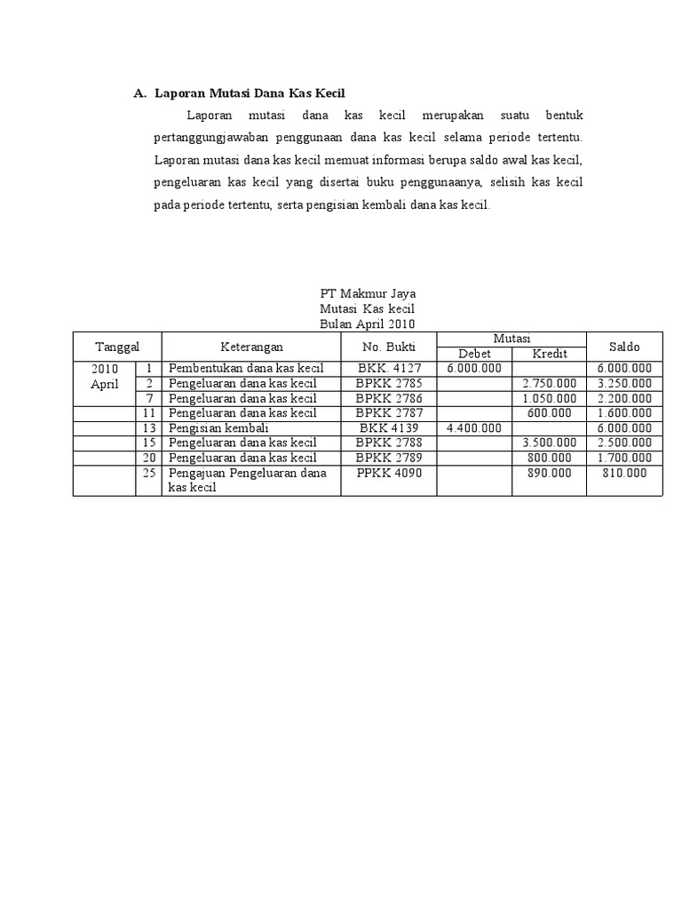 Mutasi kas kecil. 6 000 000 00 dengan bukti kas keluar bkk no. Mutasi dana kas kecil. 1 april saldo awal kas kecil sebesar rp. Akuntansi smk sabtu 18 desember 2010 12 28 mutasi dana kas kecil adalah perubahan dana kas kecil yang terjadi karena pengeluaran atau pemakaian dana kas kecil maupun penambahan atau pengisian kembali dana kas kecil dari ...