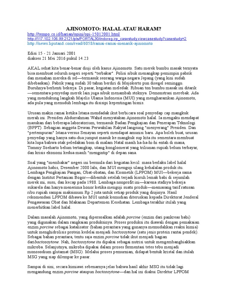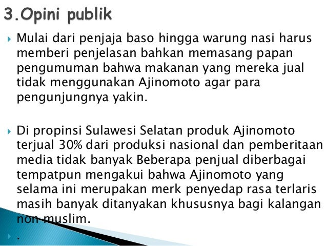 kasus ajinomoto. 1. TUGAS KELOMPOK SEJARAH "MASALAH AJINOMOTO" NAMA KELOMPOK : 1. NI PUTU PANDE CITRA .A. 2.KHOIR DINI NUDIA .F. 3.ATIKA RAHMATIKA KELAS : XII IPA 2. 2. Sehubungan dengan akan berakhirnya sertifikat Halal dari MUI untuk AJI-NO-MOTO pada September 2000, maka PT Ajinomoto Indonesia mengajukan perpanjangan sertifikat Halalnya ... 3) KASUS PELANGGARAN PT. AJINOMOTO TAHUN 2000 Contoh pelanggaran etika bisnis yang selanjutnya datang dari PT. Ajinomoto. Perusahaan yang satu ini memang sudah lama terkenal sebagai produsen terbesar yang memproduksi bumbu penyedap untuk makanan.