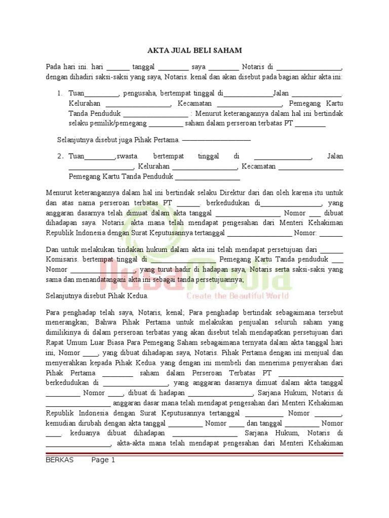 Akta jual beli saham. PDF Contoh Surat Perjanjian Jual - Beli Saham mengadakan perjanjian jual-beli saham dengan syarat-syarat dan ketentuan yang tertuang dalam 6 (enam) pasal, sebagai berikut: Pasal 1 Ayat 1 PENJUAL telah menjual kepada PEMBELI dan PEMBELI telah membeli dari PENJUAL berupa saham-saham: 1. Saham PT ----- FAKULTAS HUKUM UNIVERSITAS ISLAM INDONESIA Divisi Perpustakaan ... Cara Cek Pajak Jual Beli Rumah | Pajak Jual Beli Beli pulsa online lebih cepat dengan harga paling murah jan 2022 ini di tokopedia. 2020/07/21 · mulai dari harga, cara pembayaran, uang tanda jadi, jaminan atau saksi, penyerahan dan status kepemilikan, pajak, iuran, pungutan, masa berlaku perjanjian, hingga balik nama kepemilikan. 2022/01/01 · biaya akta jual beli biaya yang dibayarkan dapat ... Contoh Akta Jual Beli Saham ~ Lokasi Informasi saham sebelum ditandatanganinya akta ini wajib dibayar oleh Pihak Pertama. Pihak Pertama dengan ini memberi kuasa kepada Pihak Kedua dan baik bersama-sama maupun sendiri-sendiri dengan hak memindahkan kuasa ini kepada orang lain dan mencabut kembali pemindahan kuasa ini, untuk meminta kepada Direksi Perseroan, 30 Contoh Surat Perjanjian Jual Beli Saham Doc & PDF 2022 ... Surat perjanjian jual beli saham adalah dokumen yang resmi dimana wajib ditandatangi pihak penjual maupun pembeli untuk sepakat terhadap transaksi lembar atau nilai saham. Secara langsung surat perjanjian jual beli saham akan menjadi bukti transaksi yang sah dimata hukum dan dapat djjadikan alat klaim perusahaan.