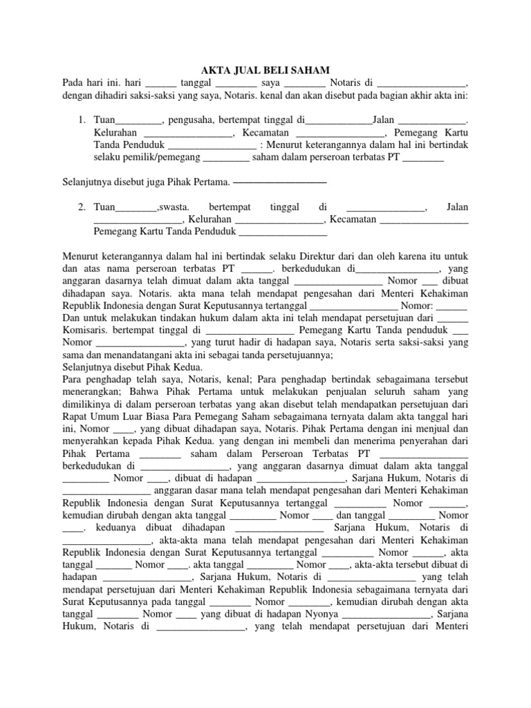 Akta Jual Beli Saham [q6ng01pez14v] - idoc.pub AKTA JUAL BELI SAHAM Pada hari ini. hari _____ tanggal _____ saya _____ Notaris di _____, dengan dihadiri saksi-saksi yang saya, Notaris. kenal dan akan disebut pada ...