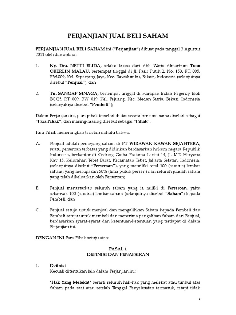 Akta Jual Beli Saham | IlmuProperti.com PASAL 1 KESEPAKATAN JUAL BELI PARA PIHAK dengan ini sepakat untuk melakukan Jual Beli dimana PIHAK PERTAMA sebagai Pihak Penjual akan menyerahkan hak milik atas Saham kepada PIHAK KEDUA dan selanjutnya PIHAK KEDUA akan menyerahkan sejumlah uang atas penyerahan Saham dari PIHAK PERTAMA. PASAL 2 KEWAJIBAN PARA PIHAK