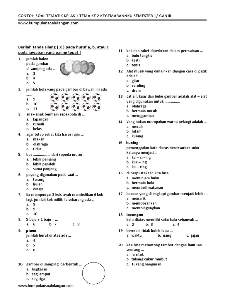 Kumpulan Soal Kelas 1 SD Semester 2 dan Kunci Jawaban Terbaru Bank Soal. SD. Rajin rajinlah belajar, Kumpulan Soal Kelas 1 SD Semester 2 hanya sebagai bekal tambahan adik-adik di sekolah. Contoh Soal IPA Kelas 1 SD Semester 2. I. Berilah tanda silang (X) pada huruf A, B atau C pada jawaban yang paling benar !