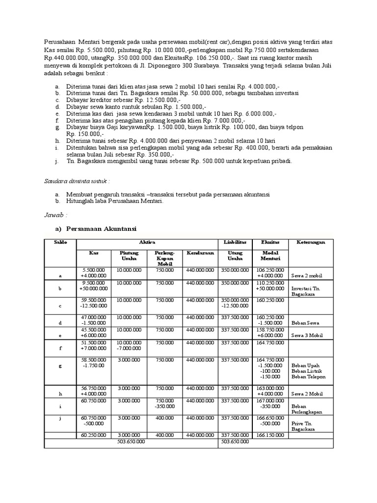 CONTOH SOAL DAN PENYELESAIANNYA - 123dok CONTOH SOAL DAN PENYELESAIANNYA. Pada tanggal 1 Agustus 2007, Karina, S.Psi. membuka sebuah kantor konsultan pendidikan. Berikut ini adalah transaksi-transaksi yang terjadi selama bulan pertama operasi perusahaan tersebut. 1. Menyerahkan kas sebesar Rp. 20.000.000,- sebagai setoran modal. 2. Contoh soal akutansi | Efendy Syafwan - Academia.edu Pada bulan desember 2007 IMEY membuka salon kecantikan di Tebing Tinggi Transaksi-transaksi yang terjadi pada bulan desember adalah : Des 01 :Imey menginvestasikan uangnya sebesar Rp.5.000.000,- Des 03 :Membeli perlengkapan secara tunai sebesar Rp.150.000,- Des 05 :Membeli peralatan secara kredit dari toko Haris sebesar Rp.800.000,- Des 15 ... Contoh Soal dan jawaban Jurnal Umum Perusahaan Dagang ... Jurnal Umum digunakan untuk mencatat selain transaksi yang dicatat pada jurnal khusus. Contoh transaksi yang tidak dapat dicatat pada jurnal khusus adalah retur pembelian dan pengurangan harga, retur penjualan dan pengurangan harga, dan transaksi lain. PD Mekar Sari pada bulan Januari 2010 memberikan data transaksi sebagai berikut: SPREADSHEET KELAS X PBS | Computers Quiz - Quizizz Preview (40 questions) Show answers. Rekening yang diperlukan untuk membuat laporan neraca adalah .... Pembelian peralatan secara tunai, akan berpengaruh pada akun .... Pembelian peralatan secara kredit, memberikan pengaruh pada jurnal ....