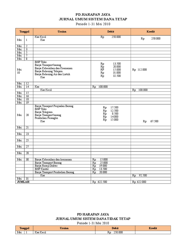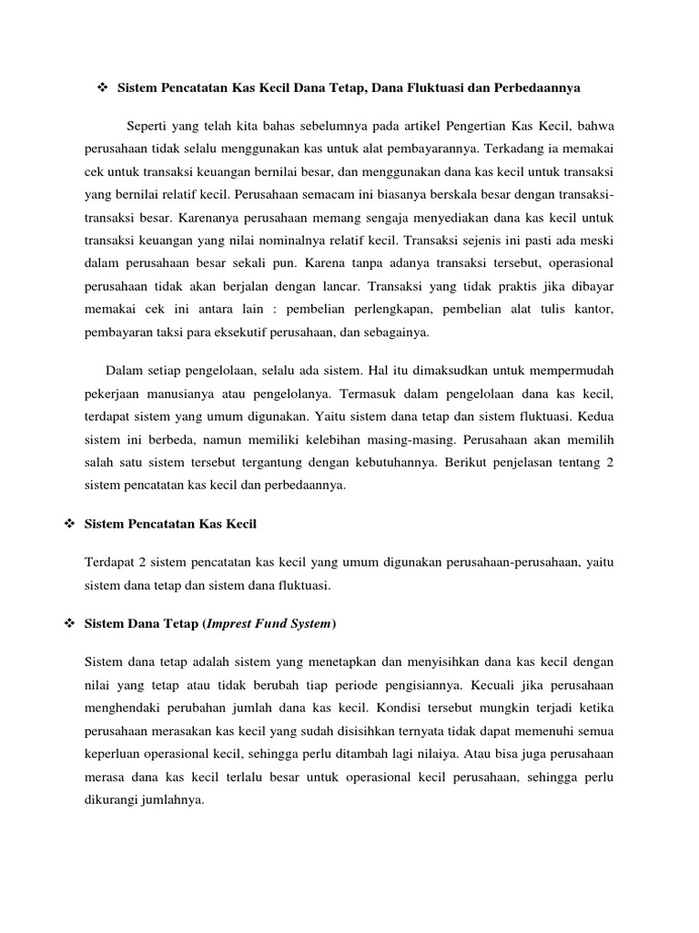 Kelebihan dan Kelemahan Sistem Pencatatan Kas Kecil : Imprest ... Sistem dana Berubah / Tidak Tetap (Fluctuation Fund System) System ini menghendaki bahwa jumlah kas kecil tidak ditetapkan tetapi sesuai dengan kebutuhan. Misal, pada waktu membuat kebijakan pertama kali perusahaan menetapkan jumlah kas kecil sebesar Rp. 1.000.000, kemudian digunakan sesuai dengan kebutuhan dan kemudian diisi kembali. √ Contoh Soal Jurnal Kas Kecil Metode Dana Tidak Tetap ... Feb 28, 2022 · Demikian contoh soal jurnak kas kecil metode dana tidak tetap dan dana tetap menjadi pembahasan sistem pengendalian internal kas. Tujuan kas kecil dibentuk adalah memudahkan pembayaran kepada lawan transaksi yang memerlukan dana tunai dan memiliki total tagihan dalam jumlah yang kurang material Pencatatan Kas Kecil Dengan Sistem Dana Tetap, Dana Fluktuasi ... Sistem dana tetap merupakan sistem yang menetapkan serta menyisihkan dana kas kecil dengan nilai yang cenderung sama atau tidak berubah pada setiap periode pengisiannya. Hal tersebut kecuali apabila perusahaan menghendaki adanya perubahan nominal dana kas kecil itu. Kas Kecil Sistem Dana Tetap dan Dana Tidak Tetap - Jun 15, 2021 — 2) Sistem dana tidak tetap (fluctuation fund system) *Pengeluaran melalui kas kecil tidak boleh lebih dari Rp.4.500.000,- dari saldo kas.