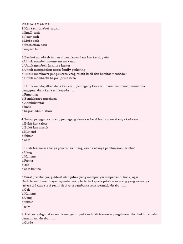 Soal Pilihan Ganda Dan Jawabannya Tentang Dana Kas Kecil ... SOAL PILIHAN GANDA DAN JAWABANNYA TENTANG DANA KAS KECIL Soal Pilihan ganda. 1.Aktiva di bawah ini yang tidak termasuk dalam kas adalah … . a.Cek mundur dari pelanggan. b.Uang dalam bentuk mata uang asing c.Cek dari pelanggan yang siap dicairkan d.Kas kecil e.Simpanan Giro di bank 2.Pernyataan berikut ini sesuai dengan dana kas kecil… . a.Digunakan untuk membayar jumlah yang relatif kecil ... Pengertian Kas Kecil, Ciri, Tujuan, Fungsi dan Metode ... Pengertian Kas Kecil, Ciri, Tujuan, Fungsi dan Metode Pengolahan Kas Kecil Terlengkap - Kas Kecil (Petty Cash) adalah sejumlah dana yang khusus dibentuk untuk pengeluaran yang bersifat relatif kecil jumlahnya. Kas kecil ini digunakan untuk mendanai pegeluaran pimpinan yang jumlahnya relatif kecil seperti dana konsumsi untuk kepentingan rapat dan lain sebagainya. Pengertian, Tujuan, Dan Metode Dalam Kas Kecil - Pt ... Maksud diadakannya kas kecil adalah agar kesekretariatan tidak perlu meminta dana kebagian keuangan setiap kali ingin mengeluarkan dana. Karena umumnya, perusahan akan sering mengeluarkan dana yang relatif kecil untuk berbagai kepentingan. Tujuan Kas Kecil Ada beberapa tujuan dibentuknya kas kecil, berikut di antaranya: