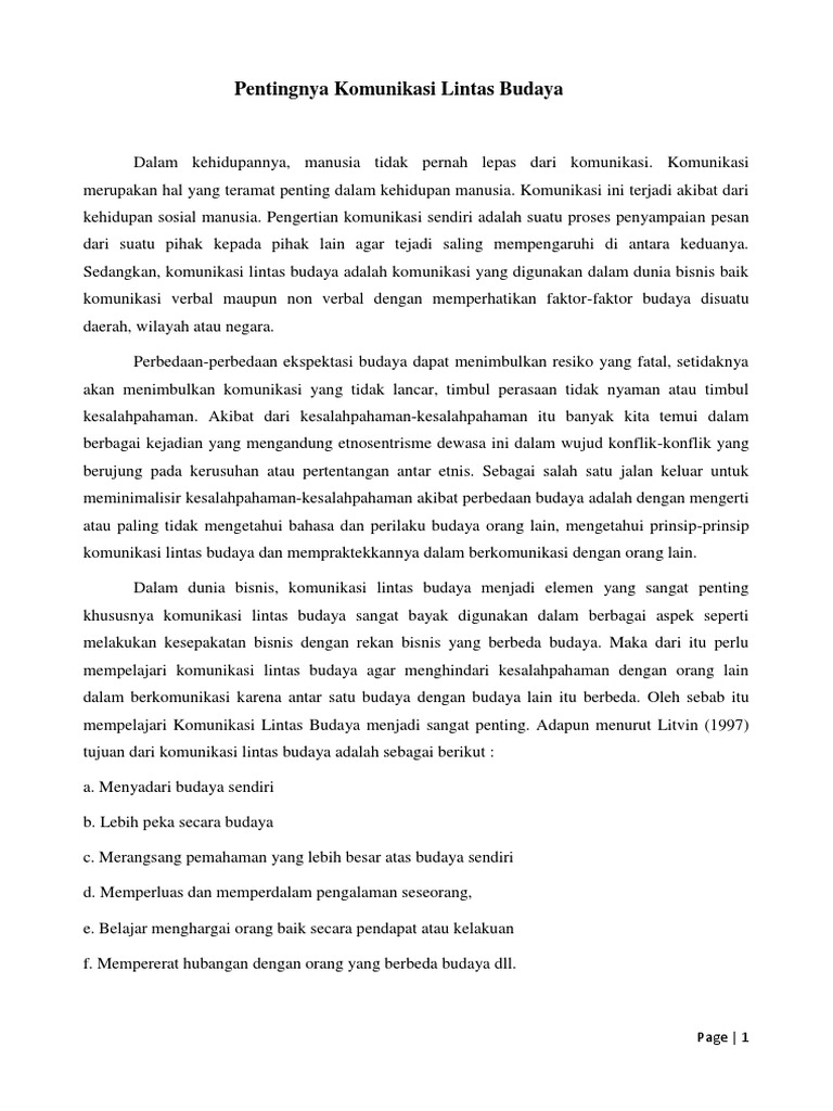 (DOC) Komunikasi Bisnis Lintas Budaya | Dimas... - Academia.edu Pentingnya Komunikasi Bisnis Lintas Budaya Semakin banyaknya pola kerja sama maupun kesepakatan ekonimi di berbagai kawasan dunia saat ini Berdasarkan beberapa pengertian budaya tersebut, ada beberapa hal penting yang perlu diperhatikan, antara lain: bahwa budaya mencakup...