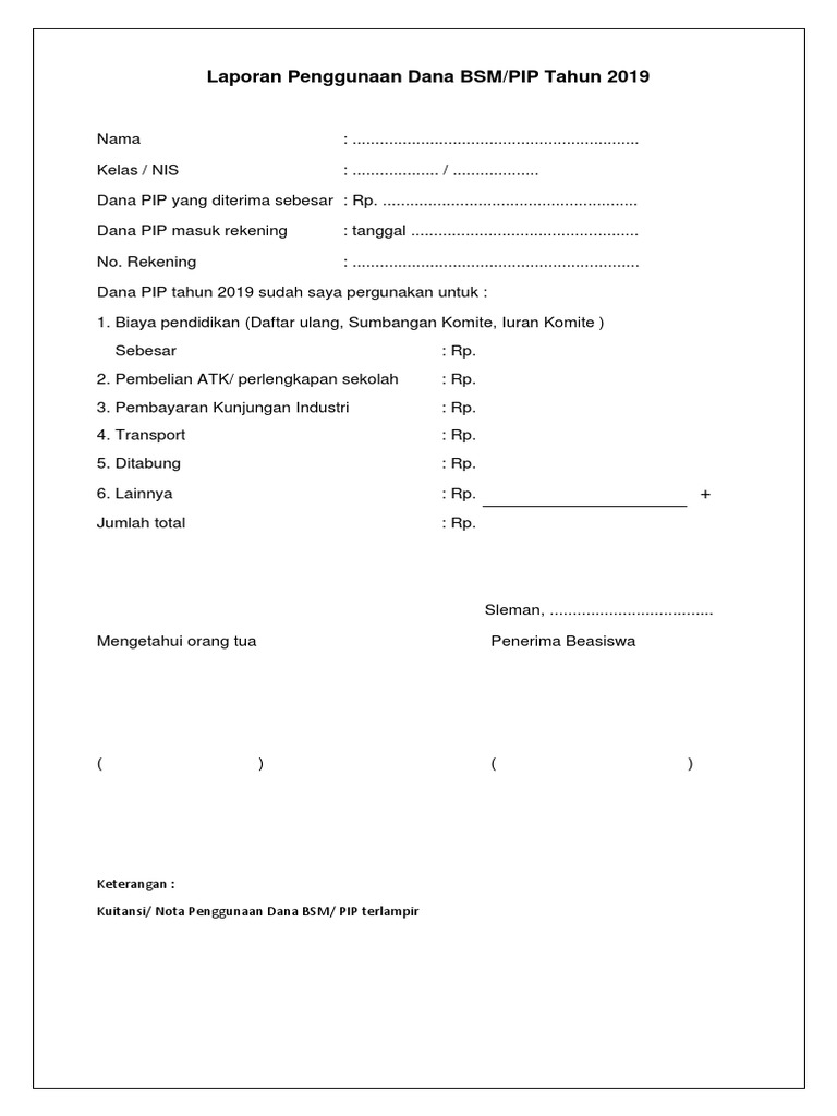 LAPORAN PENGGUNAAN DANA BEASISWA - Academia.edu LAPORAN PENGGUNAAN DANA BEASISWA PENDIDIKAN GRATIS PERGURUAN TINGGI NEGERI/SWASTA Saya yang bertanda tangan di bawah ini : Nama : NIM : Fakultas/Jurusan : Jenjang : Perguruan Tinggi : Dengan ini melaporkan bahwa penggunaan dana beasiswa Pendidikan Gratis Pemerintah Daerah Kabupaten Pangkajene dan Kepulauan yang di salurkan melalui Dinas Pendidikan Kabupaten Pangkajene dan Kepulauan Tahun ...