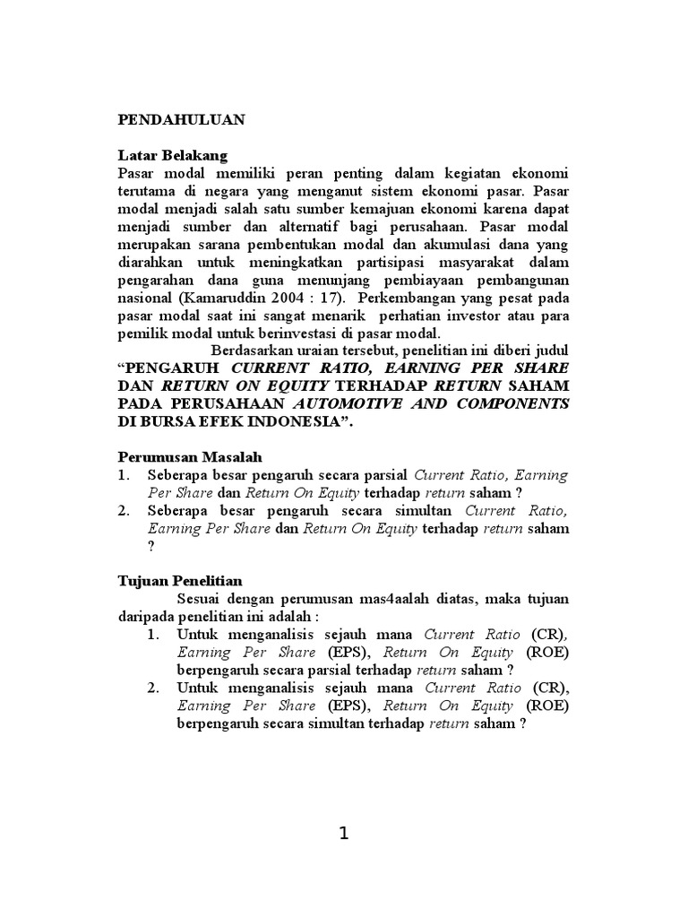 Pengaruh Earning Per Share (Eps), Return on Equity (Roe ... pengaruh earning per share (eps), return on equity (roe) dan debt to equity ratio (der) terhadap return saham dengan kebijakan dividen sebagai variabel intervening pada perusahaan industri barang konsumsi yang terdaftar di bei periode 2014-2018 PDF Analisis Pengaruh Der Dan Roe Terhadap Return Saham Pada ... Returnsaham akan meningkat seiring dengan naiknya harga saham dan returnjuga akan turun ketika harga saham turun. Faktor fundamental berupa Debt to Equity Ratio (DER) danReturn On Equity(ROE) juga dapat mempengaruhi returnsaham. Penelitiaan ini dilakukan dalam rangka untuk menguji pengaruh › en › articleApa Itu ROE (Return on Equity)? Ini Pengertian & Cara Hitung Aug 20, 2021 · Sementara itu di dunia saham, pengertian ROE adalah jumlah pendapatan bisnis bersih per dana investor yang masuk. ROE atau return on equity adalah salah satu unsur penting demi mengetahui sejauh mana suatu bisnis mampu mengelola permodalan dari para investornya. PDF Pengaruh Roa, Roe, Eps Terhadap Harga Saham Pada ... Penelitian ini bertujuan untuk mengetahui pengaruh Return On Asset (ROA, Return On Equity (ROE), Earning Per Share (EPS) terhadap harga saham pada perusahaan manufaktur sektor industri semen yang terdaftar di Bursa Efek Indonesia Tahun 2014 sampai 2018. Penelitian ini mengunakan menggunaka metode kuantitatif.