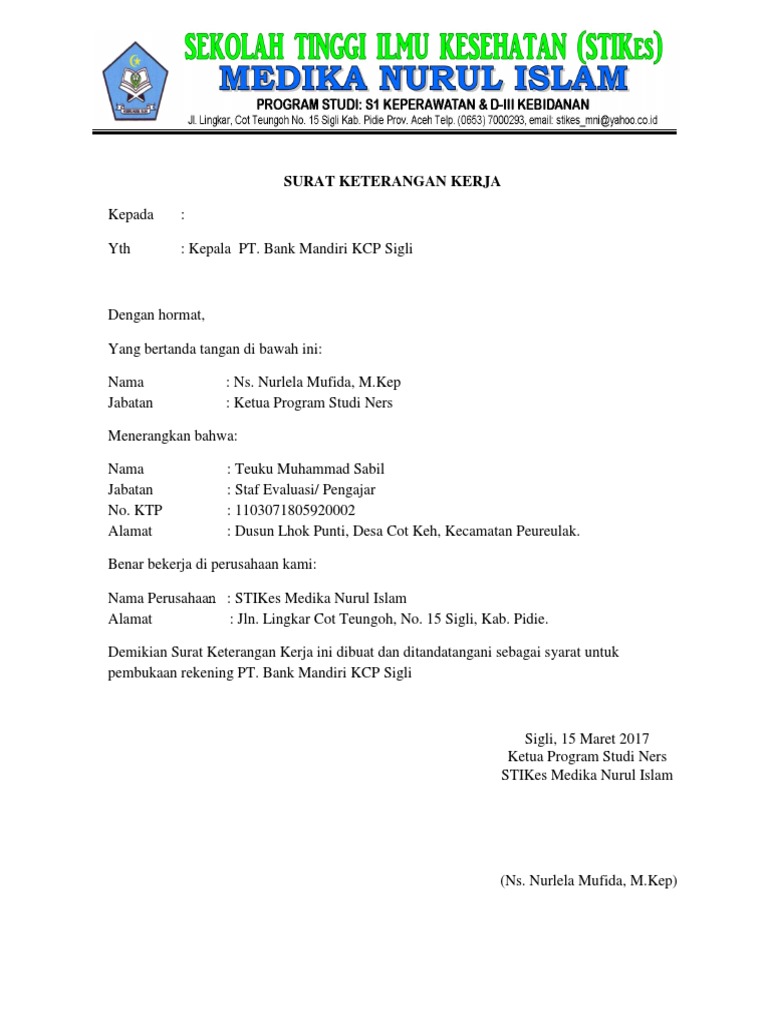 3 Contoh Surat Keterangan Kerja untuk Buka Rekening - SMK ... Mar 29, 2021 — Surat keterangan kerja untuk buka rekening diperlukan bagi Anda yang ingin membuka bank account di daerah bukan domisili.