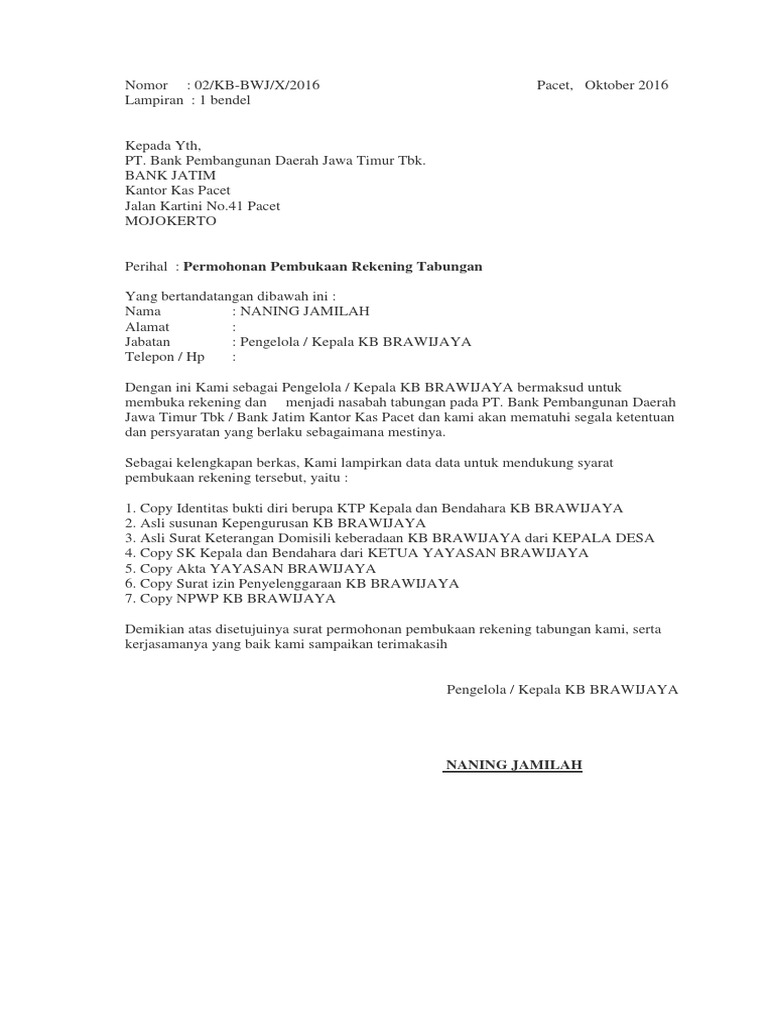 Contoh Surat Permohonan Pembukaan Rekening Bjb - Surat ... Format surat surat permohonan persetujuan. Surat referensi dari nasabah bank mandiri lain, pejabat bank mandiri atau dari bank . Butuh surat keterangan kerja untuk buka rekening bank? Bank bjb cabang cibinong untuk pembukaan rekening perusahaan kami. To maintain this website we need your help. Butuh surat keterangan kerja untuk buka rekening bank?