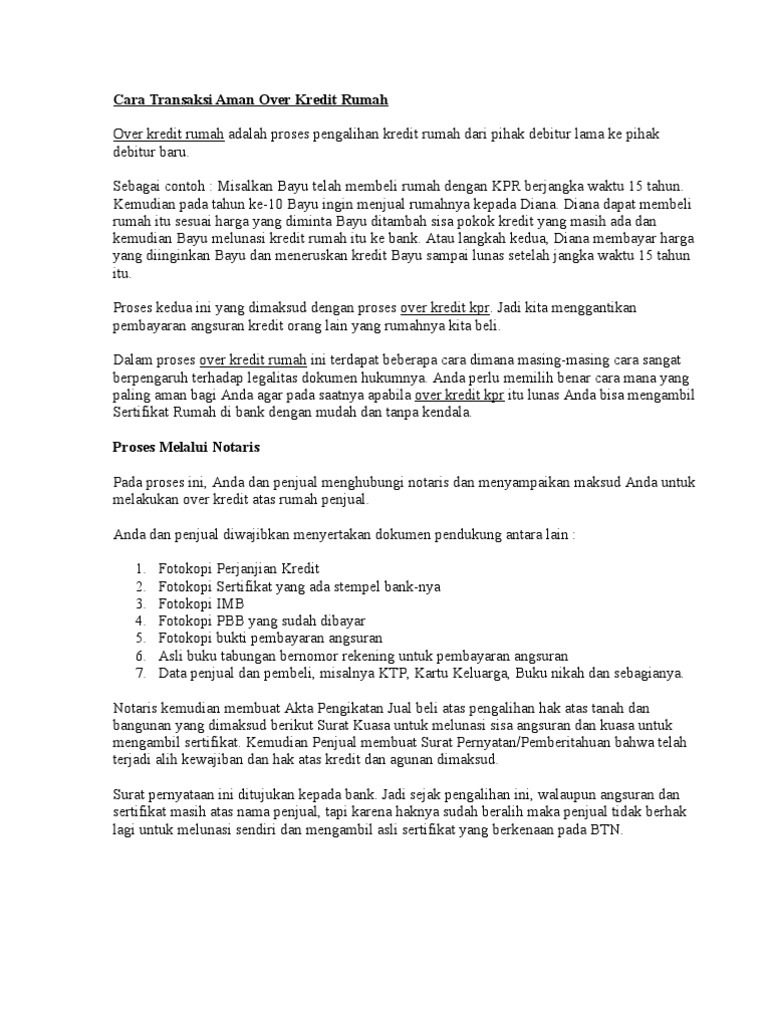 Proses Over Kredit Rumah Over kredit rumah adalah proses pengalihan cicilan rumah yang sedang berjalan dari debitur (peminjam) lama kepada debitur baru. Jadi, orang lain yang akan meneruskan pelunasan rumah lama Anda. Contoh, Anda memiliki cicilan KPR dengan tenor 15 tahun. TEKNIK OVER KREDIT RUMAH | Manguliman Juniar Blogs Over kredit rumah adalah proses pengalihan kredit rumah dari pihak debitur lama ke pihak debitur baru. Sebagai contoh : Misalkan Bayu telah membeli rumah dengan KPR berjangka waktu 15 tahun. Kemudian pada tahun ke-10 Bayu ingin menjual rumahnya kepada Diana.