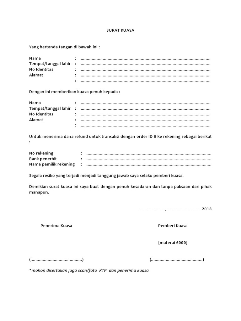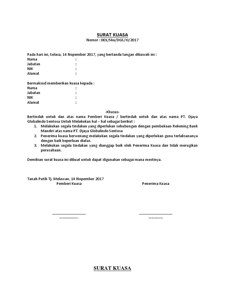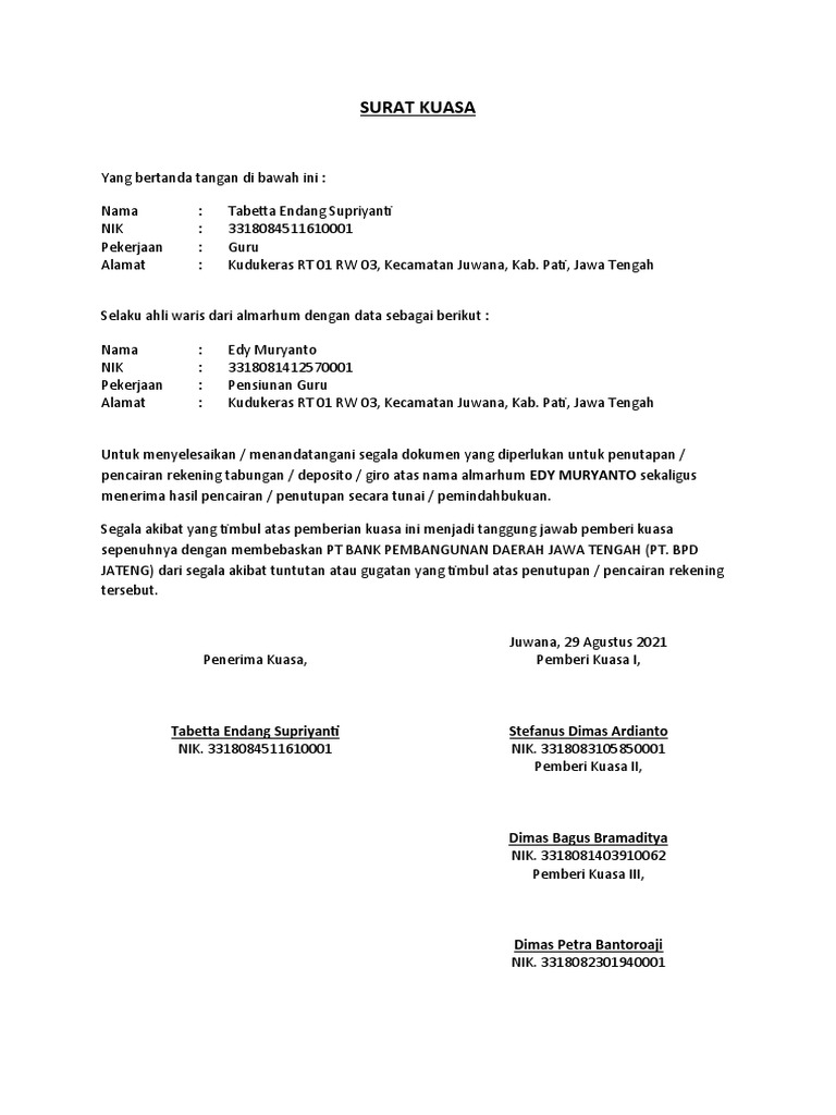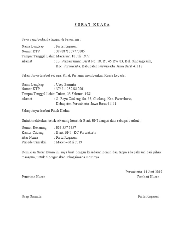 Contoh Surat Kuasa Bank BCA untuk Berbagai Keperluan ... Pihak bank akan meminta pemilik rekening untuk secara langsung melakukan pengurusan yang diinginkan. Namun, beberapa hal dalam kepengurusan ini dapat diwakilkan kepada orang yang ditunjuk. Untuk mendapatkan hak dan kewenangan mewakili nasabah, penerima kuasa harus membawa bukti tertulis berupa surat kuasa. › blog › indonesia7 Contoh Surat Kuasa Bank dan Cara Membuatnya Jan 20, 2022 · Surat kuasa tak sebatas ditujukan untuk pengambilan uang saja, tapi juga bisa diperuntukkan untuk penggunaan rekening bank. Artinya, kamu bisa melimpahkan kuasa kepada orang yang kamu beri kuasa untuk mengelola rekening bank yang kamu miliki.