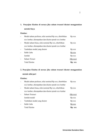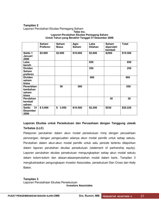 Laporan Ekuitas Pemilik: Uraian, Unsur ... - Saham Milenial Saham Milenial - Laporan ekuitas pemilik adalah catatan keuangan yang disusun oleh suatu perusahaan terkait peningkatan maupun penurunan aktiva bersih dan kekayaan selama periode tertentu berdasarkan prinsip yang dianut. Catatan tersebut disusun dalam bentuk laporan dan merupakan data penting antara perusahaan dengan investor. Ekuitas Pemegang Saham - Bedah Bisnis Langkah-langkah dalam menghitung ekuitas pemegang saham adalah sebagai berikut: Temukan total aset perusahaan pada laporan neraca pada periode yang bersangkutan. Total semua kewajiban, yang daftarnya harus terpisah dari neraca. Temukan total ekuitas pemegang saham dan tambahkan jumlahnya pada total kewajiban. Penyajian Dan Analisis Ekuitas Pemegang Saham - Penyajian ... PENYAJIAN DAN ANALISIS EKUITAS PEMEGANG SAHAM Penyajian Berikut ini merupakan contoh kelompok ekuitas pemegang saham komprehensif yang diambil dari neraca Frost Company yang meliputi sebagian besar pos-pos ekuitas. FROST CORPORATION Ekuitas Pemegang Saham 31 Desember 2007 Modal Saham Saham preferen, nilai pari $100, kumulatif 7%, diotorisasi 100.000 lembar, diterbitkan dan beredar 30.000 ...