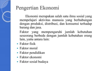 Pengertian Ekonomi Adalah: Sejarah, Manfaat, Prinsip, Motif Pengertian Ekonomi adalah suatu kegiatan manusia yang berkaitan dengan aktivitas produksi, konsumsi, dan distribusi terhadap jasa dan barang. Definisi ekonomi adalah semua yang berkaitan dengan upaya dan daya manusia dalam memenuhi kebutuhan hidupnya untuk mencapai suatu tingkatan kemakmuran.