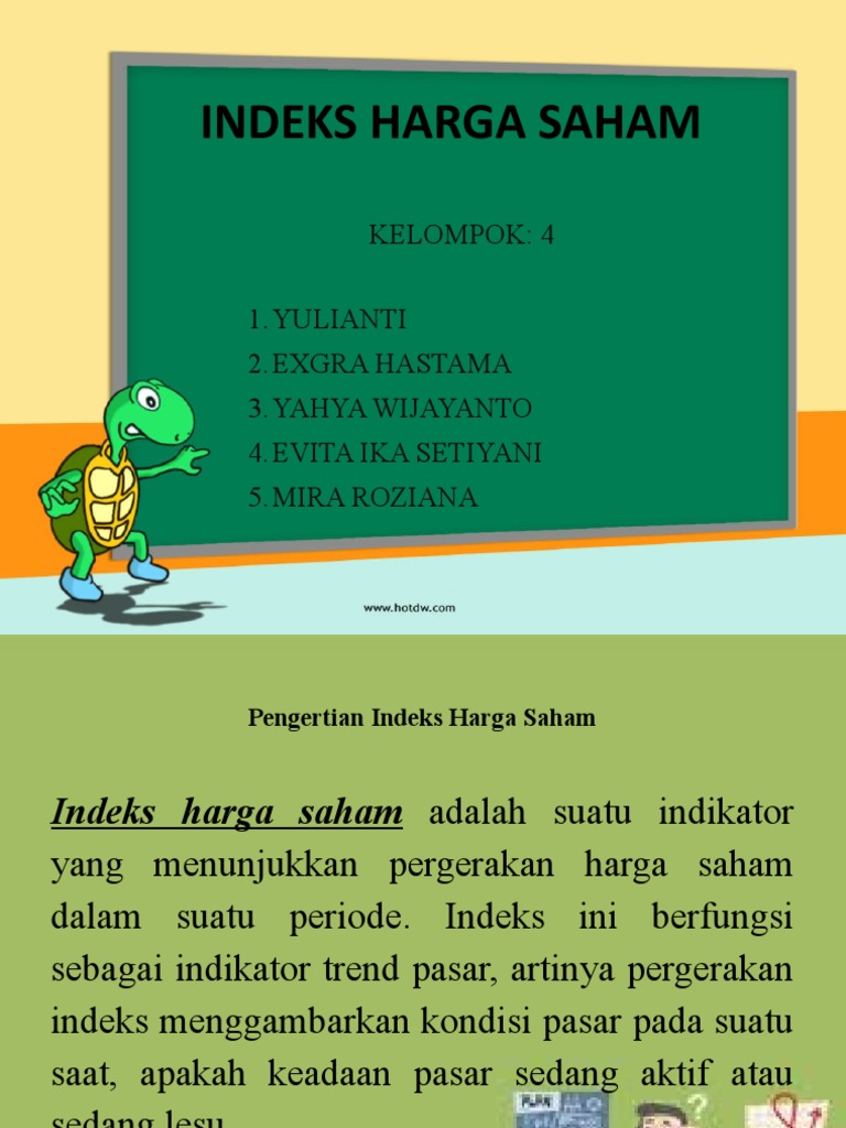 Pengertian indeks harga saham. Pengertian Indeks Harga Saham dan Daftar Index Saham di BEI Jul 01, 2021 · Pengertian Indeks Harga Saham dan Daftar Index Saham di BEI. Pergerakan harga saham diketahui dengan melihat indeks. Keberadaan indeks ini sangat membantu para investor dalam mengambil keputusan investasi. Begitu juga dengan investor pemula yang sebaiknya memahami betul penggunaan indeks, agar setiap keputusan yang diambil gak asal-asalan. Indeks Saham: Pengertian, Fungsi, dan Jenisnya | JalanTikus Menurut Bursa Efek Indonesia (BEI), indeks saham adalah ukuran statistik yang mencerminkan keseluruhan pergerakan harga atas sekumpulan saham yang dipilih berdasarkan kriteria dan metodologi tertentu, serta dievaluasi secara berkala. Pergerakan tersebut biasanya dapat mewakili alias menjadi tolak ukur situasi pergerakan pasar secara menyeluruh. Nilai pada indeks saham dipengaruhi oleh harga sahamdalam portofolio tersebut dan bobot masing-masing saham. Semakin banyak saham yang beredar dan semakin besar nilainya, maka semakin besar pula bobot saham tersebut dalam mempengaruhi pergerakan indeks. Maka dari itu, memahami indeks saham menjadi salah satu langkah penting yang harus dilakukan oleh para pelaku pasar modal termasuk investor, geng. Biar kamu gampang mencernanya, indeks saham itu sama seperti kamu mau membeli gado-gado. Di dalamnya ada beraneka ragam sayuran, tempe, tahu, telur, dan kerupuk. Nah, harga gado-gado di satu tempat bisa saja berbeda dengan tempat lain. Ada harga gad... BAB II KAJIAN TEORITIS DAN HIPOTESIS. Menurut Martalena ... Pengertian harga saham menurut Jogiyanto ( 2000), adalah :"Harga saham yang terjadi dipasar bursa pada saat tertentu yang ditentukan oleh ... Indeks harga saham Kenaikan indeks harga saham gabungan sepanjang waktu tertentu, tentunya mendatangkan kondisi investasi dan perekonomian negara dalam keadaan baik. Sebaliknya jika turun berarti iklim ... Apa Itu Dividen: Pengertian, Jenis-jenis, dan Cara ... Lalu, apa pengertian dividen, jenis-jenis, dan cara menghitungnya? Simak penjelasannya berikut ini: Pengertian Dividen. Dikutip dari situs Bursa Efek Indonesia, dividen adalah pembagian laba atau hasil yang dibayarkan kepada pemegang saham berdasarkan jumlah saham yang dimiliki. Dividen yang dibagikan, bisa berupa uang tunai maupun saham.