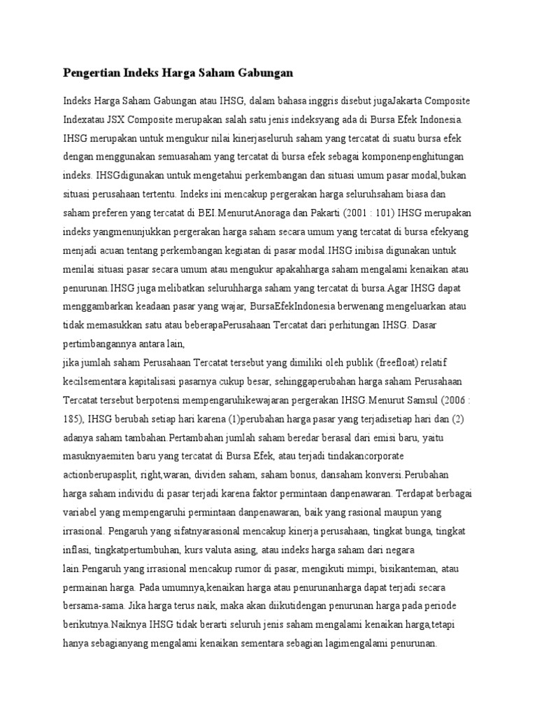 PDF BAB II TINJAUAN PUSTAKA 2.1 Landasan Teori Pengertian ... 2.1.2 Indeks Harga Saham 2.1.2.1 Pengertian Indeks harga saham Keputusan investor memilih suatu saham sebagai obyek investasinya membutuhkan data historis terhadap pergerakan saham yang beredar di bursa, baik secara individual, keompok maupun gabungan. Transaksi setiap saham mempunyai variasi Indeks Saham: Pengertian, Jenis dan Kegunaannya - Cermati ... Indeks saham adalah ukuran statistik yang mencerminkan keseluruhan pergerakan harga atas sekumpulan saham yang dipilih berdasarkan kriteria dan metodologi tertentu serta dievaluasi secara berkala. Tujuan/manfaat dari indeks saham antara lain: Mengukur sentimen pasar, Mengenal Pengertian Indeks Harga Konsumen atau IHK dan ... Indeks Harga Konsumen. IHK adalah indeks yang digunakan untuk mengukur rata-rata harga produk, baik itu barang atau jasa, yang umum dikonsumsi atau digunakan oleh konsumen rumah tangga. Indeks tersebut kerap digunakan untuk mengetahui tingkat inflasi sebuah negara serta sebagai pertimbangan terkait penyesuaian upah, gaji, dana pensiun, maupun ... Apa Indeks Saham dan Kegunaannya - MNC Sekuritas Salah satu indeks saham ada di Bursa Efek Indonesia dan banyak disebut-sebut oleh pelaku pasar modal adalah Indeks Harga Saham Gabungan (IHSG).