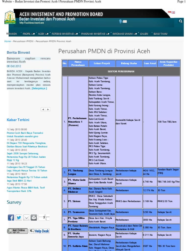 Dongkrak Investasi, Pemprov Aceh Pangkas Hambatan ... Bisnis.com, MEDAN - Badan Investasi dan Promosi (Bainprom) Aceh terus aktif meminimalisasi hambatan yang dialami oleh para investor. Salah satunya dengan memfasilitasi dan pembentukan satuan tugas khusus untuk penyelesaian berbagai masalah. Hal ini dilakukan untuk meningkatkan realisasi investasi di provinsi tersebut. Badan Pusat Statistik Provinsi Aceh Badan Pusat Statistik Provinsi Aceh (Statistics of Aceh Province) Jl. Tgk. H. M. Daud Beureueh No. 50 Kuta Alam Banda Aceh, Telp (62-651) 23005, Mailbox : pst1100@bps.go.id Untuk tampilan terbaik Anda dapat gunakan berbagai jenis browser kecuali IE, Mozilla Firefox 3-, and Safari 3.2- dengan lebar minimum browser beresolusi 275 pixel. BADAN INVESTASI DAN PROMOSI ACEH. Oleh: Kabid Pengembangan ... Aceh Menjadi Salah-Satu Daerah Tujuan Utama Investasi 2017 CAPAIAN INVESTASI 2013 & OPTIMISME Investor Minati Aceh RAPAT MITRA KERJA DENGAN DEWAN PERWAKILAN RAKYAT ACEH (DPRA) RENCANA KERJA ANGGARAN DAN PROGRAM PRIORITAS TAHUN Badan Investasi & Promosi Aceh Badan Investasi dan Promosi Aceh Akan Fasilitasi Hambatan ... MEDIAACEH.CO, Banda Aceh - Badan Investasi dan Promosi Aceh berkomitmen menyelesaikan segala permasalahan terkait penanaman modal yang berinvestasi di Aceh. Hal