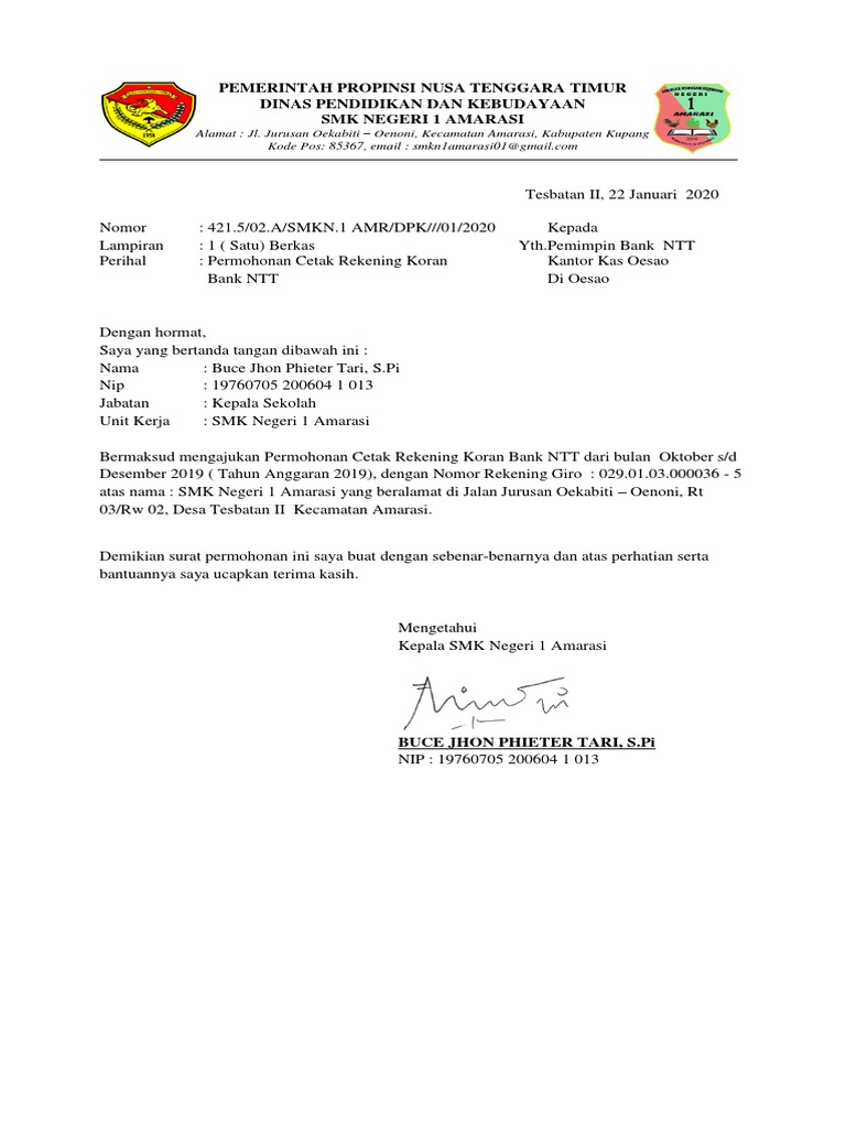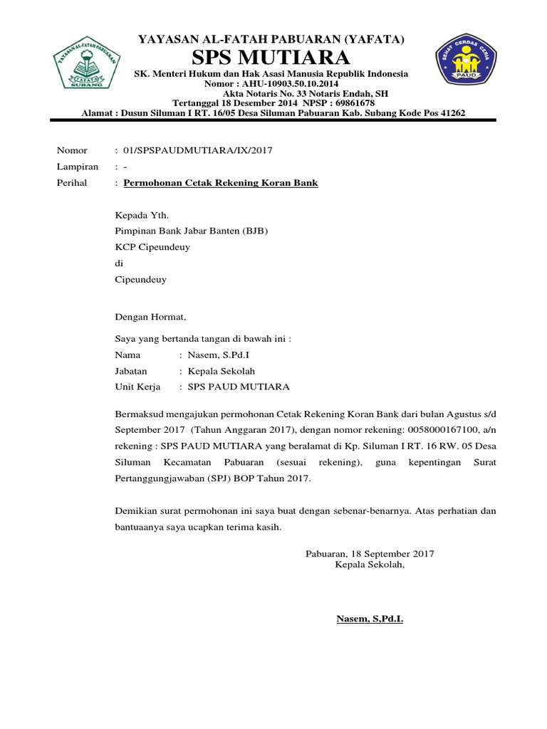Contoh Surat Kuasa Nomor Rekening Download contoh surat kuasa cetak rekening koran di berbagai bank yang dapat diunduh secara lengkap dan gratis tanpa perlu daftar. Berikut contoh surat pemeberitahuan kepada bapak ibu guru oleh kepala sekolah melalui waka kurikulum. Demikian contoh surat pemberitahuan perubahan nomor rekening dengan format profesional yang baik. Contoh Surat Permohonan Rekening Koran Bank - tasADMIN Di dalam laporan keuangan sekolah terutama laporan dana BOS, rekening koran juga diperlukan, dan kadang diminta oleh Dinas Pendidikan setempat. Pada artikel kali ini saya akan berbagi contoh format surat permohonan rekening koran bank, agar nantinya sekolah dapat dicetakan rekening korannya dari Bank. Contoh Surat Permohonan Rekening Koran Bank Yuk Cek Contoh Surat Permohonan Rekening Koran Bank ... Yuk simak contoh surat permohonan rekening koran bank mandiri. Contoh surat permohonan rekening koran ke bank mandiri dapatkan contoh. surat permohonan rekening koran. contoh surat kuasa bank mandiri surat surat kuasa uang Pelajari juga soal permohonan serta baca lagi materi contoh surat permohonan rekening koran bank mandiri . 7 Contoh Surat Kuasa Bank Untuk Pengambilan Uang Yang Benar Surat Permohonan Sekolah untuk Cetak Rekening Koran Bank ... Surat ini digunakan sekolah untuk untuk cetak Rekening Koran Rekening BOS (Bantuan Operasional Sekolah). Surat permohonan ini akan diberikan kepala sekolah kepada pihak bank sebagai keterangan bahwa sekolah akan meminta rekening koran dalam pertanggungjawaban pelaporan dana BOS sekolahnya. Silahkan lihat di bawah ini: