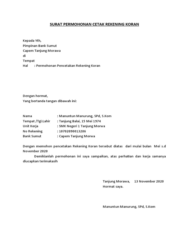 27 Contoh Permohonan Rekening Koran Ke Bank 2022 - Peluang ... Sep 20, 2019 · kumpulan lengkap contoh surat permintaan rekening koran bank mandiri. Bagaimana cara membuat surat permohonan pencetakan koran bank? Bermaksud mengajukan permohonan cetak rekening koran bank dari bulan januari s/d desember 201 5 (tahun anggaran 2015), dengan nomor rekening: Sdn cipangramatan 01 yang beralamat di kp.