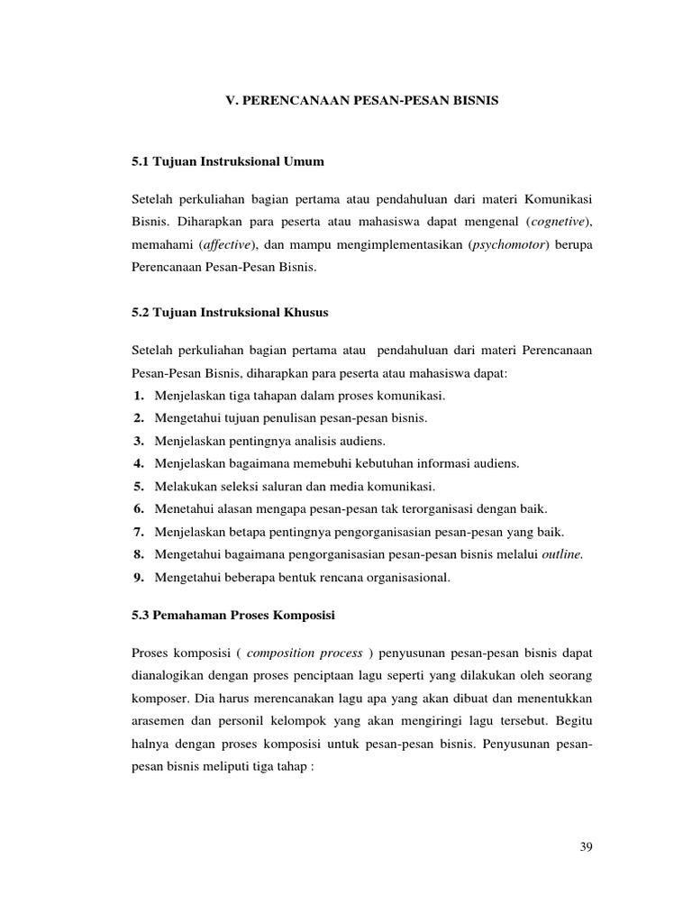 Makalah PERENCANAAN PESAN-PESAN BISNIS - Make Better Than ... Tujuan dalam penulisan pesan bisnis yang efektif adalah lebih bersiafat untuk menyatakan ide daripada mengesankan lawan komunikasi. Dalam komunikasi bisnis ada beberapa langkah termasuk perencanaan pesan-pesan bisnis. Perencanaan pesan-pesan bisnis mencakup pesan-pesan yang di smpaikan secara tertulis dan pesan-pesan yang di sampaikan secara lisan. PDF PROSES PERENCANAAN PESAN BISNIS 1. Menetapkan Tujuan Pesan ... • Perencanaan pesan bisnis adalah proses penetapan berbagai kegiatan yang akan dilakukan sebelum pesan bisnis tersebut diluncurkan. • Purwanto (2006:69) proses perencanaan meliputi kegiatan; 1. Menentukan tujuan 2. Menganalisisaudiens 3. Menentukan ide pokok 4. Menyeleksi saluran dan media 1. Menetapkan Tujuan Pesan Bisnis • Penentuan tujuan yang jelas bagi organisasi akan dapat membantu dalamprosespengambilankeputusan yang mencakup: a. Keputusan untuk Meneruskan Pesan jika pesan ...