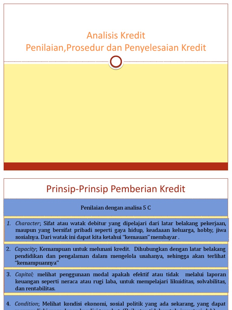 (PPT) ANALISIS KREDIT.ppt | Abdul Waris - Academia.edu 1 f Syarat-syarat bank teknis Analisis kredit merupakan suatu proses untuk mengevaluasi apakah nasabah dapat diberikan kredit atau tidak. Pemberian kredit mengadung risiko. Untuk itu perlu dinilai atas dasar syarat-syarat bank teknis yang terkenal dengan 5 C, yaitu: Character, capacity, capital, collateral, dan condition. 2 f1.