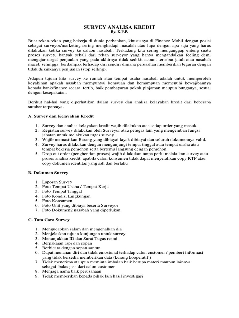 PDF Analisis Laporan Keuangan Calon Debitur Dalam Pengajuan ... Analisis Laporan Keuangan Calon Debitur Dalam Pengajuan Kredit PadaPT. Bank Rakyat Indonesia (Persero) Tbk Cabang Enrekang" B. Rumusan Masalah Mengingat luasnya aspek yang dapat dihubungkan dengan judul di atas maka masalah yang akan dibahas adalah apakah hasil analisis laporan keuangan calon debitur telah sesuai dengan kriteria pemberian ... PDF Analisis Portofolio Kredit Perbankan Umum Dan Syariah contoh tesis 2017. analisis portofolio kredit perbankan umum dan syariah. analisis posisi pembiayaan per sektor ekonomi pada. makalah ekonomi penerapan manajemen resiko perbankan syariah. skripsi bank syariah analisis tingkat kesehatan bank. analisis faktor faktor yang memengaruhi pembiayaan. jurnal analisis Analisis Kredit - Pengertian, Perbandingan, Tujuan dan Contoh Contoh rasio keuangan yang digunakan dalam analisis kredit adalah rasio cakupan layanan utang (DSCR). DSCR adalah ukuran tingkat arus kas yang tersedia untuk membayar kewajiban utang saat ini, seperti pembayaran bunga, pokok, dan sewa. Rasio cakupan layanan utang di bawah 1 menunjukkan arus kas negatif. SURVEY ANALISA KREDIT | arykonde Kondisi keuangan dilihat dari rekening bank Status kantor (kontrak/milik sendiri?) I. KESIMPULAN ANALISA SURVEYOR FINANCE Analisa Obyek Pembiayaan (Barang) Barang yang akan dibiayai harus layak untuk dibiayai Pastikan obyek pembiayaan dipergunakan oleh calon nasabah sendiri Apakah memang hasil survey barang tersebut sangat diperlukan oleh pemohon
