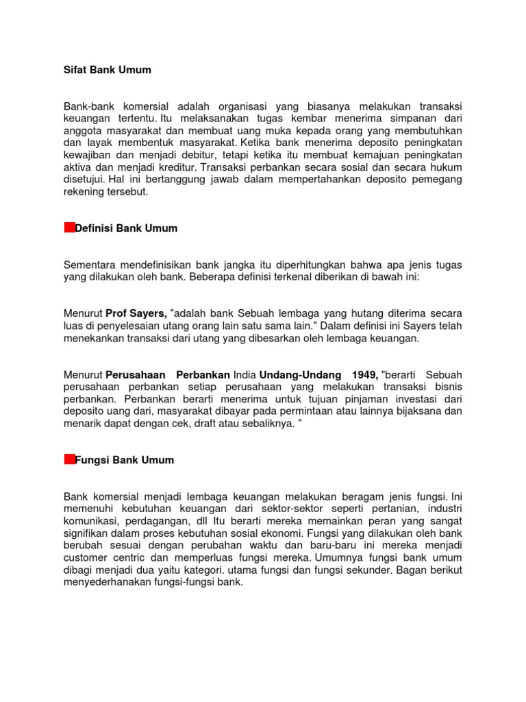 Fungsi dan peran bank umum dalam pengembangan ekonomi ... Baca artikel ini untuk mempelajari tentang fungsi dan peran bank umum dalam pengembangan ekonomi suatu negara. Padahal ada berbagai jenis bank; namun bank umum menonjol sebagai kategori bank yang paling menonjol dan populer. Fungsi bank umum dapat dijelaskan dengan mengklasifikasikan ini ke dalam tiga kategori berikut: Fungsi primer Fungsi sekunder Fungsi modern Berikut ini adalah 5 (Lima) Pengertian, Fungsi, Tugas dan Jenis Bank Umum ... Jun 17, 2017 · Bank umum adalah lembaga keuangan yang bertugas menghimpun dana dari masyarakat (funding) dalam bentuk simpanan dan menyalurkan kembali kepada masyarakat dalam bentuk kredit (lending), bank umum juga berfungsi sebagai agent of trust, agent of equity, dan agent of development. 3. 3 Fungsi dan Tugas Bank Umum yang Harus Anda Tahu Fungsi yang pertama dari bank umum adalah sebagai agen pembangunan atau agen of development. Dimana bank umum memiliki kewajiban untuk ikut turut serta dalam pembangunan Negara Indonesia. Sehingga setiap bank umum yang ada di Indonesia haruslah memiliki visi dan misi yang jelas dalam pembangunan Indonesia. Bank Umum: Pengertian, Fungsi, dan ... - Rangkul Teman Tugas dan Fungsi Bank Umum 1. Penciptaan Uang Giral 2. Mendukung Kelancaran Mekanisme Pembayaran 3. Penghimpun Dana Simpanan Masyarakat 4. Mendukung Kelancaran Transaksi Internasional 5. Penyimpanan Barang-Barang Berharga 6. Pemberian Jasa-Jasa Lainnya Kegiatan Usaha Bank Umum 1. Himpun Dana dari Masyarakat 2. Memberikan Kredit 3. Memindahkan Dana